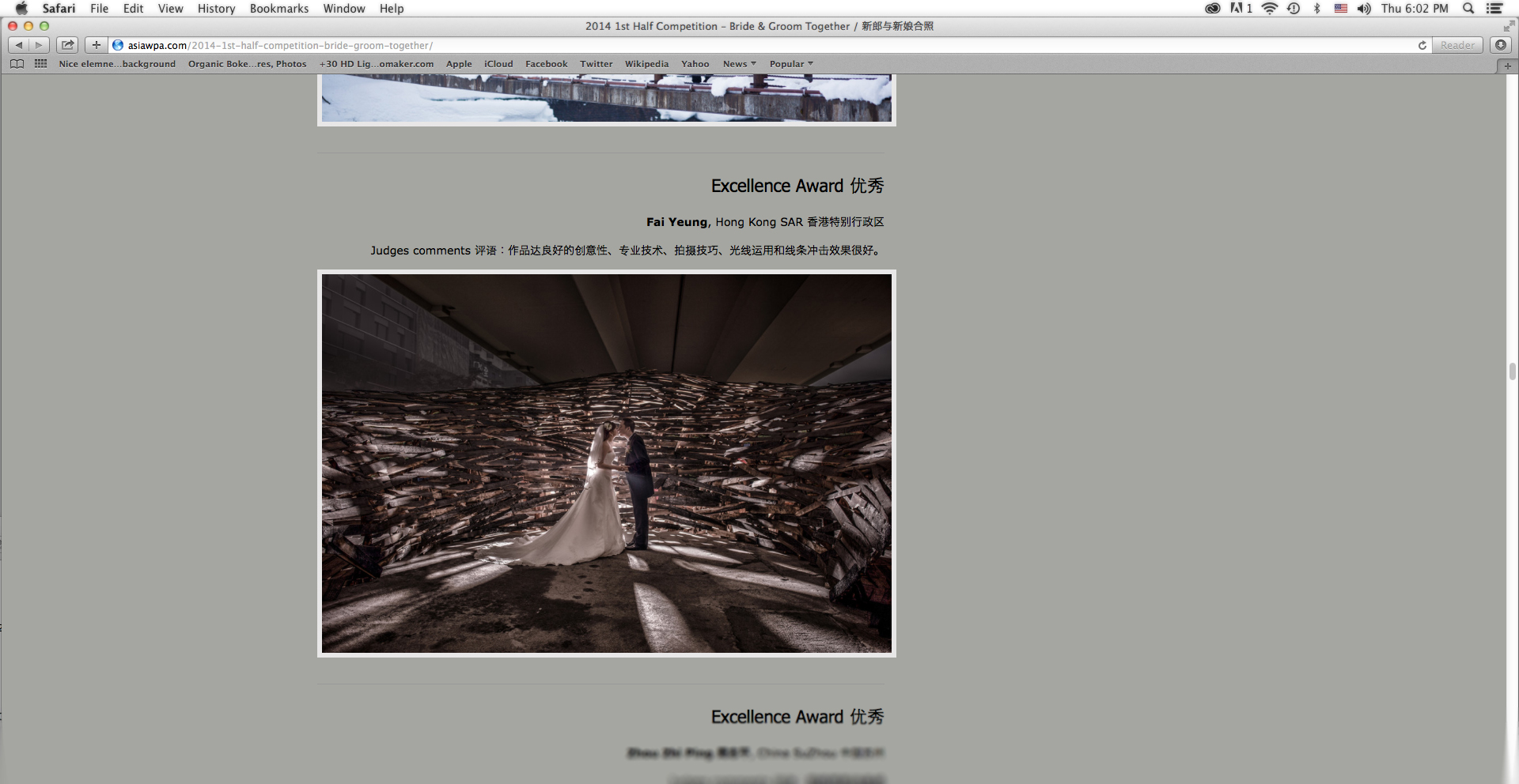 繼上次於WPPI(國際婚紗攝影師公會)得獎後, 再次於國際性比賽獲獎
